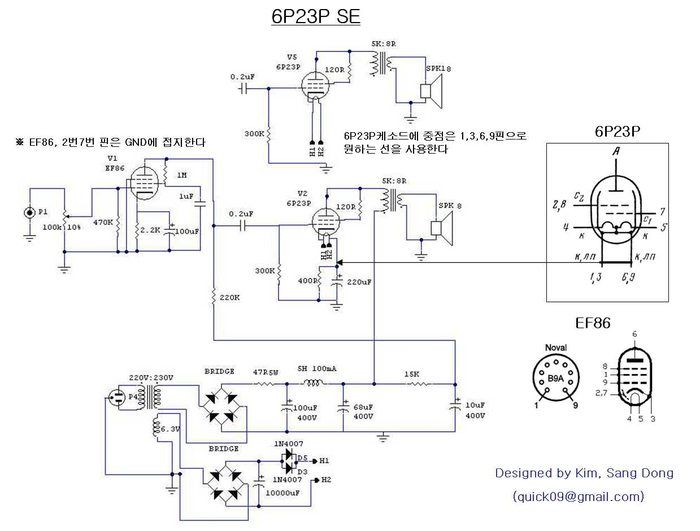 이관을 이용해서 간단하게 싱글로 앰프를 만든 회로인데,