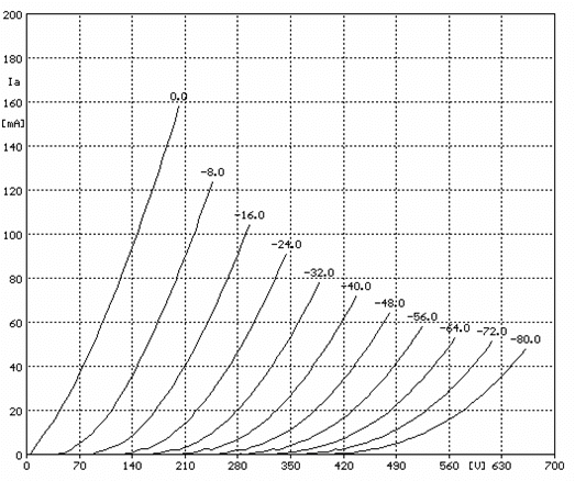 아래 그래프는 7EY6진공관의3결접속(Grid2=Plate)하였을때의 특성 커브를 나타냅니다.